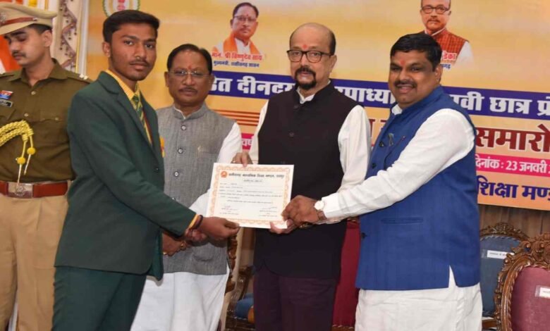 रामानुजनगर। छत्तीसगढ़ माध्यमिक शिक्षा मंडल की हाईस्कूल परीक्षा वर्ष 2025 में टॉप-10 प्रावीण्य सूची में 9वां स्थान प्राप्त कर जिले का नाम रोशन करने वाले आयुश साहू को राजधानी रायपुर स्थित लोक भवन (छत्तीसगढ़ मंडपम्) में आयोजित प्रतिभा सम्मान समारोह में सम्मानित किया गया। इस अवसर पर राज्यपाल रमेन डेका के मुख्य आतिथ्य एवं मुख्यमंत्री विष्णुदेव साय की अध्यक्षता में वर्ष 2024 एवं 2025 के कक्षा 10वीं व 12वीं के टॉप मेधावी विद्यार्थियों को सम्मान प्रदान किया गया।