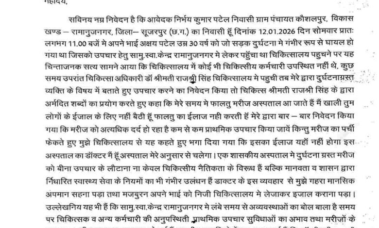रामानुजनगर। सामुदायिक स्वास्थ्य केंद्र रामानुजनगर में सड़क दुर्घटना में गंभीर रूप से घायल युवक को इलाज से वंचित किए जाने का मामला सामने आने के बाद सरकारी स्वास्थ्य सेवाओं की संवेदनशीलता पर गंभीर सवाल खड़े हो गए हैं। ग्राम कौशलपुर निवासी निर्भय कुमार पटेल ने स्वास्थ्य विभाग को दिए गए लिखित शिकायत पत्र में बताया है कि 12 जनवरी की सुबह करीब 11 बजे उनके भाई अक्षय पटेल (30 वर्ष) सड़क दुर्घटना में गंभीर रूप से घायल हो गए थे। परिजन उन्हें तत्काल सरकारी अस्पताल रामानुजनगर लेकर पहुंचे, लेकिन आरोप है कि अस्पताल में लंबे समय तक कोई डॉक्टर या जिम्मेदार स्टाफ मौजूद नहीं था। घायल युवक दर्द से तड़पता रहा। बाद में महिला चिकित्सक श्रीमती राज श्री सिंह अस्पताल पहुंचीं और परिजनों ने दुर्घटनाग्रस्त मरीज की गंभीर स्थिति बताते हुए इलाज की मांग की, तो बिना मरीज को देखे कथित रूप से डॉक्टर ने यह कहा कि— “मेरे समय में ऐसे फालतू मरीज मत लाया करो, यहां इसका इलाज नहीं होगा, अस्पताल मेरे हिसाब से चलेगा।” शिकायतकर्ता के अनुसार बार-बार निवेदन के बावजूद न तो प्राथमिक उपचार किया गया और न ही मरीज को भर्ती किया गया, बल्कि उसे अस्पताल से बाहर जाने के लिए कह दिया गया। गंभीर हालत में घायल मरीज को सरकारी अस्पताल से लौटा देना न केवल चिकित्सकीय नियमों और मानवता के खिलाफ है, बल्कि यह सरकारी स्वास्थ्य तंत्र की जवाबदेही पर भी बड़ा प्रश्नचिह्न लगाता है।